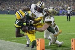 GREEN BAY, Wis. (AP) — Josh Jacobs gained 107 yards from scrimmage and scored a touchdown for a sixth straight game as the Green Bay Packers clinched a playoff berth while producing the first shutout of the NFL season, 34-0 over the hapless New Orleans Saints. Green Bay improved to 11-4 and earned its fifth postseason appearance in six years. New Orleans played without injured quarterback Derek Carr and running back Alvin Kamara. Rookie Spencer Rattler started and went 15 of 30 for 153 yards with an interception and a fumble. The Packers have won nine of their last 11 games.