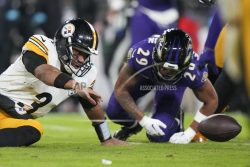 BALTIMORE (AP) — All season long, the Pittsburgh Steelers have depended on a standard formula for winning: stop the run, protect the ball, force the opponent into mistakes. It’s not glitzy, but that’s exactly how Pittsburgh put itself into position to win the AFC North on Saturday. Unfortunately for the Steelers, they strayed from that recipe and absorbed a 34-17 beatdown from the Baltimore Ravens. Instead of clinching its first division title since 2020, Pittsburgh fell into a first-place tie with the Ravens with two games to play. Baltimore rushed for 220 yards, including 162 by Derrick Henry. The Ravens also took advantage of two giveaways by Pittsburgh quarterback Russell Wilson. (Photo: AP)