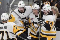 BOSTON (AP) — Philip Tomasino scored a tiebreaking goal in the third period, Tristan Jarry made 31 saves and the Pittsburgh Penguins beat the Boston Bruins 2-1. Tomasino’s first goal of the season with 12:34 remaining in the game came when the forward walked in from the left circle after the Bruins failed to clear the puck. Pittsburgh’s Rickard Rakell scored his ninth goal of the season with less than a second remaining in the second period. Charlie Coyle scored and Jeremy Swayman made 33 saves for Boston.