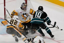 SAN JOSE, Calif. (AP) — Sidney Crosby and Evgeni Malkin each had a goal and an assist, Tristan Jarry stopped 31 shots for his 22nd career shutout, and the Pittsburgh Penguins beat the San Jose Sharks 3-0. Anthony Mantha also scored for the Penguins, who improved to 4-2-0 on the season. Alex Nedeljkovic made 24 saves for the Sharks, and San Jose outshot an opponent for the first time this season but was unable to score. The Sharks, an NHL-worst 20-50-12 last season, remained the league’s only winless team at 0-3-2. San Jose has now started four straight seasons winless through five games. (Photo: AP)