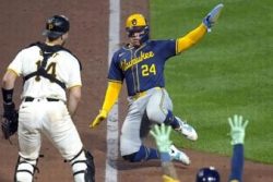PITTSBURGH (AP) — Willy Adames secured his first 30-20 season in the Milwaukee Brewers’ 7-2 win over the Pittsburgh Pirates on Tuesday night. Adames stole second after an infield single, his first of two hits, with one out in the second inning. It was the 20th stolen base for the seven-year veteran to go along with 32 home runs. He and 20-year-old rookie Jackson Chourio (21 homers, 21 stolen bases) are the first Brewers teammates to go 20-20 in the same season. Hoby Milner (5-1) pitched a perfect fifth inning for the win in relief of Tobias Myers. Pirates starter Bailey Falter (8-9) gave up four runs and five hits, striking out five and walking one in five innings.