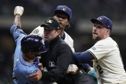 MILWAUKEE (AP) — Punches were thrown when a brawl broke out between the Tampa Bay Rays and Milwaukee Brewers. The fracas ensued after Jose Siri grounded out against Brewers pitcher Abner Uribe leading off the eighth inning. Uribe and Siri exchanged words near first base and things quickly became heated. With an umpire standing between them trying to keep the peace, Uribe threw a punch at Siri, who then took a wild swing at the reliever as both dugouts and bullpens emptied quickly. The animosity between Siri and the Brewers had been building all night. He took a long look at his home run in the third off Freddy Peralta, who drilled Siri with a 3-0 fastball in the sixth. That led to Peralta and Milwaukee manager Pat Murphy getting ejected.