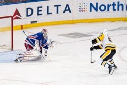 NEW YORK (AP) — Sidney Crosby had two goals and an assist and Alex Nedeljkovic made 28 saves as the Pittsburgh Penguins beat New York 5-2, snapping the Rangers’ five-game winning streak. Bryan Rust also scored twice and Emil Bemstrom added a goal for Pittsburgh, which ended a four-game losing streak in New York and improved to 14-9-3 in its last 26 games against Rangers. The Penguins lost both previous games this season at home against the first-place Rangers and were making their lone appearance at Madison Square Garden. Kaapo Kakko and Jack Roslovic scored goals for the Rangers, and Igor Shesterkin finished with 16 saves.