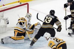 BOSTON (AP) — David Pastrnak reached 40 goals for the third consecutive season, and the Boston Bruins beat the fading Pittsburgh Penguins 5-1. Coming off a 4-1 victory over Toronto on Thursday, the Bruins posted consecutive regulation wins for the first time since Jan. 20 and 22. They are fighting for the NHL’s top record. Pavel Zacha had two goals and an assist for Boston, which has 91 points. Brad Marchand and Jake DeBrusk each had a goal and an assist, and Linus Ullmark made 38 saves. Kris Letang scored for Pittsburgh, and Alex Nedeljkovic stopped 17 shots.