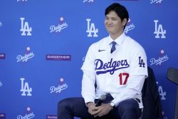 LOS ANGELES (AP) — Shohei Ohtani opened his first news conference with the Los Angeles Dodgers by dodging questions about whether he had a second Tommy John surgery. He says: “It was a procedure. I’m not sure what it was called.” Speaking to media for the first time since Aug. 9, he also refused to say what other teams he negotiated with before the agreement last weekend on a record $700 million, 10-year contract. Ohtani wore a navy business suit with a white shirt and blue tie, took off the jacket and put on a Dodgers home jersey with No. 17.