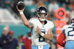 MIAMI GARDENS, Fla. (AP) — Rookie Will Levis threw for a career-high 327 yards and directed two touchdown drives in the final 4 1/2 minutes, and the Tennessee Titans rallied to stun Miami 28-27, knocking the Dolphins out of the top spot in the AFC. The Titans held Tua Tagovailoa and Miami’s explosive offense in check for most of the game but still fell behind by two touchdowns in the fourth quarter, thanks to critical mistakes that gave short fields to the Dolphins. Raheem Mostert ran for TDs of 3 yards and 5 yards to put Miami ahead 27-13. But Levis threw a TD pass to DeAndre Hopkins and then set up a 3-yard run by Derrick Henry for the go-ahead score.