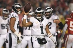 KANSAS CITY, Mo. (AP) — Jalen Hurts ran for a pair of touchdowns, including a go-ahead tush-push score in the fourth quarter, and the Eagles rallied from a 10-point halftime deficit to beat the Chiefs 21-17 in a Super Bowl rematch. Philadelphia exacted at least a little bit of revenge for its 38-35 loss in February. Its defense shut out Patrick Mahomes and the Chiefs’ prolific in the second half. Kansas City had the ball near midfield with less than 2 minutes to go, but Marquez Valdes-Scantling had a would-be 51-yard touchdown pass slip through his hands, and the Eagles made a stand on fourth down to put the game away.