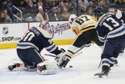 COLUMBUS, Ohio (AP) — Sidney Crosby recorded his 16th career hat trick, scoring twice in the third period, rallying the Pittsburgh Penguins over the Columbus Blue Jackets 5-3 for their league-leading fifth straight win. Crosby extended his point streak to nine games with the 558th, 559th and 560th goals of his career, also adding an assist. Jake Guentzel and Erik Karlsson each contributed a goal and an assist, and Tristan Jarry stopped 28 shots in his fourth consecutive win. Kirill Marchenko, Yegor Chinakhov and Alexandre Texier scored, and Elvis Merzlikins stopped 38 for Columbus, which has lost six straight and two in a row at home.