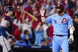 PHILADELPHIA (AP) — Bryce Harper hit a three-run homer and a solo shot to lead the Philadelphia Phillies to a 10-2 win over the Atlanta Braves in Game 3 of the National League Division Series. The Phillies took a 2-1 lead and can advance to the NL Championship Series for the second straight season with a win at home Thursday. Harper’s homers answered ridicule from Braves shortstop Orlando Arcia. Arcia had poked fun at Harper after his baserunning blunder played a role in the Phillies’ loss in Game 2. Nick Castellanos, Trea Turner and Brandon Marsh also homered for the Phillies.