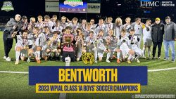 #7 Bentworth rallied from a two-goal deficit in the second half to knock off #1 Charleroi in overtime, the Bearcats winning their first-ever WPIAL soccer title. Arlo McIntyre scored on a penalty kick in the 11th minute and Dylan Klinger found the net late in the half for the Cougars. Ryan Moessner got Bentworth on the board just past the halfway mark of the second half. Andrew Vipperman tied the game with a header with less than five minutes to play in regulation, set up by Ryan Colbert. Colbert then scored the unassisted golden goal in the 92nd minute from about 8 feet out when Charleroi goalkeeper Nate Mazon didn’t control a save. Diontae Hays made six saves for the Bearcats. Both teams had already clinched spots in the PIAA playoffs that begin Tuesday night. (photo courtesy of WPIAL)
