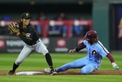 PHILADELPHIA (AP) — Kyle Schwarber went deep, Bryce Harper went off on an umpire and was ejected and Trea Turner went from second to home on a stolen base but the Pittsburgh Pirates topped the Philadelphia Phillies 3-2 on Thursday night. Schwarber launched his 46th homer of the season, which matched last year’s total when he led the National League, into the second deck for a 1-0 lead in the first. Turner stole third base in the eighth and came around to score on a wild throw by catcher Jason Delay that made it 3-2. Harper was ejected when he argued a called check swing on strike three.