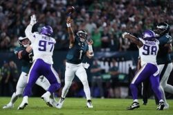 PHILADELPHIA (AP) — Jalen Hurts ran for a pair of 1-yard touchdowns and threw a 63-yard TD pass to DeVonta Smith, D’Andre Swift ran for 175 yards and a score, and the NFC champion Philadelphia Eagles held off the turnover-prone Minnesota Vikings 34-28. Hurts shook off a sluggish passing performance in the first half when he connected with Smith for the scoring strike in the third quarter that made it 27-7. It almost wasn’t enough as Kirk Cousins tried to rally the Vikings late. But Minnesota couldn’t overcome four lost fumbles as it fell to 0-2. The Eagles are 2-0.
