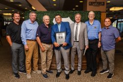 Lanny Frattare was enshrined onto the Pittsburgh Pirates Media Wall of Fame Wednesday afternoon, the 11th member of the Pittsburgh media to be so honored. Frattare broadcast Pirates Baseball from 1976 through 2008, calling more games as the team’s play-by-play voice than any other announcer in the 100+ year history of the franchise. During the luncheon, hosted by Pirates owner Bob Nutting, team president Travis Williams and emceed by current broadcaster Greg Brown, Frattare paid tribute to Bob Prince, thanked his family, former manager Jim Leyland and his broadcast partners, many of whom attended the celebration. Since leaving the Pirates, Frattare has been an associate professor at Waynesburg University and has announced the PONY League World Series games for the past 10 years on WJPA. Broadcast partners pictured: John Wehner, Bob Walk, Steve Blass, Frattare, Greg Brown, Kent Tekulve, Tim Neverett. (photo courtesy of Pittsburgh Pirates)