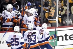 PITTSBURGH (AP) — Brock Nelson scored on a breakaway in overtime and the New York Islanders rallied to defeat the Pittsburgh Penguins 4-3. Nelson beat Tristan Jarry to the blocker side at 2:13 of the extra period as the Islanders swept the season series against Pittsburgh for the first time in franchise history. Anders Lee had two goals and Hudson Fasching also scored for the Islanders, who scored twice in the final 5:29 of regulation to force overtime. Ilya Sorokin stopped 33 shots and assisted on the winning goal for New York. Jake Guentzel, Jason Zucker and Josh Archibald scored for Pittsburgh. Tristan Jarry made 24 saves for the Penguins.