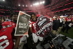 INGLEWOOD, Calif. (AP) – Stetson Bennett threw two touchdown passes and ran for two scores in the first half as No. 1 Georgia demolished No. 3 TCU 65-7 to become the first team to win consecutive College Football Playoff national championships. The Bulldogs became the first repeat champs since Alabama went back-to-back a decade ago and left no doubt that they have replaced the Crimson Tide as the new bullies on the block. TCU, the first Cinderella team of the CFP era, never had a chance against the Georgia juggernaut and suffered the most lopsided loss in a national title game dating to the start of the BCS in 1998.