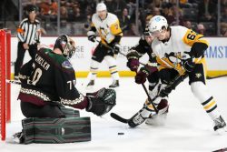 TEMPE, Ariz. (AP) – Jake Guentzel scored two goals, Casey DeSmith stopped 23 shots and the Pittsburgh Penguins beat the Arizona Coyotes 4-1 to end a six-game losing streak. Pittsburgh fell into an early hole on Barrett Hayton’s first-period goal, but Guentzel scored twice in a little over three minutes in the second. Jason Zucker also scored, Jeff Carter added an empty-net goal and Sidney Crosby had two assists in Pittsburgh’s first win since Dec. 20. Karel Vejmelka had 24 saves for Arizona, which has lost five straight.