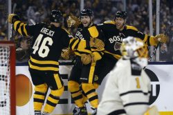 BOSTON (AP) — Jake DeBrusk scored his second goal of the third period with just over two minutes remaining and the NHL-leading Boston Bruins rallied for a 2-1 victory over the Pittsburgh Penguins in the Winter Classic on Monday at Fenway Park. Linus Ullmark made 26 saves for Boston, which is 8-0-3 in its last 11 games. Because the Bruins were the “home” team, they improved their home record to 19-0-3 this season. Kasperi Kapanen scored for the Penguins, and Casey DeSmith made 19 saves in relief of Tristan Jarry, who left with an apparent injury late in the first period. Playing on an unseasonably warm day with temperatures in the upper 40s (4 Celsius) early in the game, the Bruins won for the fourth time in the NHL’s 14th annual showcase event that was held at the home of the MLB’s Boston Red Sox in front of a sellout crowd 39,243. Playing with the stadium lights illuminating the ice, DeBrusk swooped in and banged home the rebound of Taylor Hall’s backhand shot with 2:24 left. DeBrusk collected a pass from Brad Marchand at the side of the net seconds after a power play expired, spun in front and slipped it behind DeSmith to tie it at the 7:46 mark of the period.