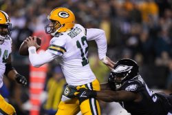 PHILADELPHIA (AP) – Jalen Hurts ran for 157 yards to set an Eagles record for a quarterback, and Packers QB Aaron Rodgers injured his ribs in Philadelphia’s 40-33 victory over Green Bay. Hurts also threw for 153 yards and two touchdowns for the NFC-best Eagles, who moved to 10-1 for the fifth time in history. Miles Sanders ran for 143 yards and two scores as Philadelphia rushed for 363 overall, the second-best total for the franchise. Rodgers left in the third quarter with his team trailing 34-23 after grimacing his way through a drive that led to a Packers field goal. He had already been playing with a broken thumb and took several hard hits.