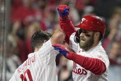 PHILADELPHIA (AP) – Bryce Harper and Alec Bohm helped the Philadelphia Phillies hit a World Series record-tying five home runs in a 7-0 win over the Houston Astros in Game 3 of the World Series. The Phillies lead the series 2-1. Brandon Marsh, Kyle Schwarber and Rhys Hoskins also homered for the Phillies. Ranger Suarez tossed three-hit ball over five shutout innings for the Phillies. Houston starter Lance McCullers Jr. allowed all five home runs. He’s the first pitcher ever to allow five homers in a World Series game.