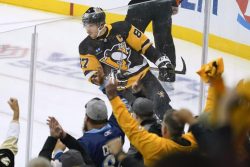 PITTSBURGH (AP) – Sidney Crosby, Evgeni Malkin and Kris Letang started their 17th season together with a bang as the Pittsburgh Penguins raced by the Arizona Coyotes 6-2. The longtime franchise cornerstones combined for two goals and four assists. The trio joined former New York Yankee stars Derek Jeter, Mariano Rivera and Jorge Posada as the longest-tenured teammates in major North American professional sports history. Jake Guentzel, Jason Zucker, Bryan Rust and Kasperi Kapanen also scored for Pittsburgh. Nick Ritchie scored twice for the rebuilding Coyotes.