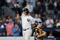 NEW YORK (AP) – Aaron Judge disappointed fans by staying stuck at 60 homers but doubled twice and scored on Oswaldo Cabrera’s first-inning grand slam that started the New York Yankees to a 14-2 rout of the Pittsburgh Pirates. A day after hitting home run No. 60 to spark a stunning five-run, ninth-inning rally capped by Giancarlo Stanton’s game-ending slam, Judge doubled on the first pitch to him in the first and fifth innings. Judge leads the AL in average, home runs and RBIs, in position to become the first Triple Crown winner in a decade. Cabrera and Gleyber Torres (pictured) had five RBIs each.