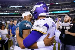 PHILADELPHIA (AP) – Jalen Hurts threw for 333 yards and a touchdown and he ran for 57 yards and two more scores to lead the Philadelphia Eagles to a 24-7 win over the Minnesota Vikings. Hurts had 301 total yards in the first half in the breakout game of his young career. The Eagles led 24-7 at halftime. Cornerback Darius Slay had two interceptions in the second half. The Eagles improved to 2-0. The Vikings are 1-1. Kirk Cousins and top target Justin Jefferson struggled for Minnesota.