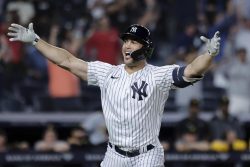 NEW YORK (AP) – Aaron Judge hit his 60th home run and Giancarlo Stanton followed minutes later with a game-ending grand slam, completing the New York Yankees’ stunning five-run, ninth-inning rally to beat the Pittsburgh Pirates 9-8. Judge moved within one of Roger Maris’ American League record when he turned on a sinker from right-hander Wil Crowe and drove it 430 feet into the left-field bleachers, pulling New York within 8-5. Judge matched the 60 home runs Babe Ruth hit for the 1927 Yankees to set a big league record that stood for 34 years.