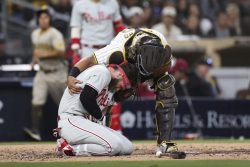 PHILADELPHIA (AP) – Phillies slugger Bryce Harper will have surgery Wednesday to repair his broken left thumb and the team hopes the 2021 NL MVP can play again this season. Manager Rob Thomson did not offer a timetable for Harper’s return, only saying he hoped Philadelphia’s franchise player would return this year. Harper’s thumb was broken when he was hit by a 97 mph pitch from San Diego Padres left-hander Blake Snell on Saturday night. The 29-year-old Harper is hitting .318 with 15 home runs, 48 RBIs and a .985 OPS, and has helped the Phillies recently surge back into playoff contention.