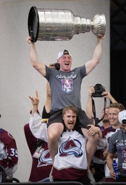 DENVER (AP) – The parade through the streets of Denver to celebrate the Colorado Avalanche’s Stanley Cup title offered a little bit of everything. That included dogs wearing Avalanche sweaters, Nathan MacKinnon jumping off the fire truck to shake hands with the swarm of fans and defenseman Bowen Byram being momentarily confused for a fan by security. It also included the crowd chanting “We Got The Cup,” and a shirtless Gabriel Landeskog hoisting the Cup they secured by beating the Tampa Bay Lightning. It was the Avalanche’s first title in 21 years and third in the franchise’s history.