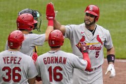 PITTSBURGH (AP) – Albert Pujols hit two home runs, then caught the warmup tosses when star catcher Yadier Molina made his first pitching appearance to close out the St. Louis Cardinals’ 18-4 romp over the Pittsburgh Pirates. Molina gave up a pair of homers and four runs while working the ninth inning, eventually completing the Cardinals’ three-game sweep. But it was not all fun and games for St. Louis. Starter Steven Matz lasted only four pitches before being pulled with stiffness in his left shoulder. Pujols boosted his career home run count to 683. Pujols had a pinch-hit homer in the fifth inning and a three-run drive in the ninth off Pirates infielder Josh VanMeter in the ninth.