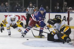 NEW YORK (AP) – Frank Vatrano and Artemi Panarin scored in the second period, Igor Shesterkin stopped 30 shots for his fourth shutout of the season and the New York Rangers beat the Pittsburgh Penguins 3-0. Dryden Hunt added an empty-net goal in the final minute and Mika Zibanejad had two assists for New York, which is 6-1-1 in its last eight games – including three victories against Pittsburgh. Tristan Jarry had 21 saves for Pittsburgh, which has lost four of five and is 2-5-1 in its last eight.