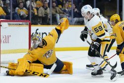 NASHVILLE, Tenn. (AP) – Juuse Saros made 35 saves to lead the Nashville Predators to a 4-1 victory over the Pittsburgh Penguins. Mattias Ekholm, Tanner Jeannot, Eeli Tolvanen and Yakov Trenin scored for the Predators, who have won five of six. Roman Josi had three assists and Colton Sissons added two. Jake Guentzel had the lone goal and Casey DeSmith stopped 21 shots for Pittsburgh, which won its previous two games.