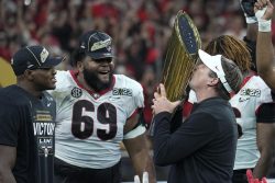 INDIANAPOLIS (AP) – Stetson Bennett delivered the biggest throws of his storybook career and Georgia’s defense sealed the sweetest victory in program history, vanquishing rival Alabama 33-18 to win the College Football Playoff title game. The Bulldogs won their first national title in 41 years. Bennett connected with Adonai Mitchell on a 40-yard touchdown to give Georgia a 19-18 lead with 8:09 left. He then hooked up with Brock Bowers for a 15-yard TD on a screen to put the Bulldogs up with with 3:33 left. The final blow came from the defense. Kelee Ringo intercepted an underthrown deep ball down the sideline by Heisman Trophy winner Bryce Young and returned 79 yards for a touchdown.