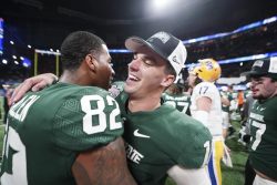 ATLANTA (AP) – Payton Thorne’s 22-yard touchdown pass to Jayden Reed gave No. 11 Michigan State the lead with less than three minutes remaining and the Spartans overcame an 11-point deficit to beat No. 13 Pittsburgh 31-21 on Thursday night in the Peach Bowl. Linebacker Cal Haladay’s 78-yard interception return for a touchdown with 22 seconds remaining ended Pitt fill-in quarterback Davis Beville’s bid for a last-minute comeback in the game the Panthers played without star QB Kenny Pickett. Thorne threw two fourth-quarter touchdown passes as Michigan State (11-2) rallied. Cam Bright returned a fumble recovery 26 yards for a touchdown 20 seconds into the second half for Pittsburgh (11-3). The Panthers lost fill-in starting quarterback Nick Patti to an injury in the first quarter.