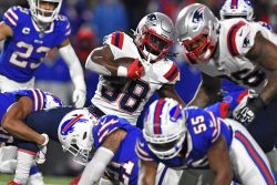 ORCHARD PARK, N.Y. (AP) – The Patriots have sole possession of first place in the AFC East following a 14-10 win over the second-place Bills. Damien Harris scored on a 64-yard run in blustery conditions in which Mac Jones attempted just three passes. The Pats outgained the Bills 222 to 99 in yards rushing, with Harris delivering a season-high 111. Defensive back Miles Bryant sealed the victory by batting down Josh Allen’s pass at the goal line with Buffalo facing fourth-and-14 at New England’s 18 with 1:55 remaining. Bills QB Josh Allen was 15 of 30 for 145 yards and a TD. New England is 9-4 following its seventh win in a row. Buffalo is 7-5.