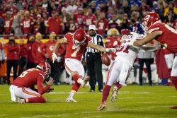 KANSAS CITY, Mo. (AP) – Desperate for a win, the Kansas City Chiefs got one against the short-handed New York Giants. Harrison Butker hit a pair of fourth-quarter field goals, including the go-ahead 34-yarder with 1:07 left to give the Chiefs a 20-17 comeback victory against the Giants. Patrick Mahomes threw for 275 yards with a touchdown and an interception for the 4-4 Chiefs, who had to overcome two more turnovers along with 12 penalties for more than 100 yards. Tyreek Hill led the Chiefs with 12 catches for 94 yards and a score. The 2-6 Giants have lost three games with late field goals this season. Daniel Jones had 222 yards passing with two touchdowns and a pick for New York, but he also was sacked three times. The Giants were without running back Saquon Barkley and wide receiver Kenny Golladay, both out with injuries.