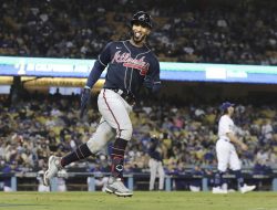 UNDATED (AP) – The Los Angeles Dodgers are still alive in the NL Championship Series after snapping out of their hitting funk while getting an outstanding performance from six relievers. Chris Taylor slammed three home runs and drove in six as the Dodgers clobbered the Braves, 11-2 in Game 5, sending the series back to Atlanta. Taylor belted two-run homers in the second and fifth innings before delivering a solo shot. He overshadowed teammate AJ Pollock, who provided a solo shot and a three-run blast. Taylor had four of the Dodgers’ 17 hits, while Pollock, Trea Turner and Cody Bellinger had three apiece. The LA bullpen limited Atlanta to three runs while striking out nine over 8 1/3 innings. Dodgers relievers allowed their team to rebound after starter Joe Kelly left with an injury in the first inning, shortly after giving up a two-run homer to Freddie Freeman. Losing pitcher Max Fried was lifted with two out in the fifth, charged with five runs and eight hits. Game 6 is Saturday in Atlanta.