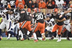 CLEVELAND (AP) – The Cleveland Browns put together just enough offense with quarterback Baker Mayfield and running backs Nick Chubb and Kareem Hunt out with calf injuries. Third-string back D’Ernest Johnson rushed for 146 yards in guiding the Browns’ offense in a 17-14 victory over Denver. Johnson scored on a 4-yard run in the first half and picked up 52 yards on seven carries as the Browns chewed up the final 5:17. Case Keenum threw for a TD and was 21 of 33 for 199 yards in his first start in two years. Denver quarterback Teddy Bridgewater threw a pair of TD passes and gutted it out while playing with foot and quadriceps injuries. He finished 23 of 33 for 187 yards with one interception. The Broncos finished the game without linebacker Von Miller because of a sprained ankle. The Browns improved to 4-3, while the Broncos dropped their fourth in a row since a 3-0 start.