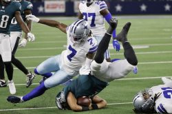 ARLINGTON, Texas (AP) – Dallas Cowboys quarterback Dak Prescott lost the handle on the ball while being rushed in the end zone, spotted the Eagles an easy touchdown and then proceeded to dismantle them. Prescott threw for three touchdowns in his first home game since he suffered an ankle injury on the same field almost a year ago, Trevon Diggs returned an interception 59 yards for a score and Dallas dominated Philadelphia 41-21 on Monday night. Except for the fumble, Prescott was efficient, going 21 of 26 for 238 yards without an interception in the first NFC East game for both teams. Ezekiel Elliott ran for a season-high 95 yards and two touchdowns, and tight end Dalton Schultz had the first two-TD game of his career. Prescott’s first game at AT&T Stadium since the season-ending compound fracture and dislocation of his right ankle in Week 5 last year against the New York Giants was also the return to full capacity, with 93,267 inside and the retractable roof open at the $1.2 billion facility.