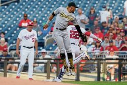 WASHINGTON (AP) – Kyle Schwarber homered again to snap a seventh-inning tie and drove in two runs for the Washington Nationals in their 3-2 victory over the Pittsburgh Pirates. Jon Lester pitched 5 1/3 solid innings to help the Nationals win for the third time in four games. Schwarber’s homer was his fourth in three days. The Nationals moved him to the leadoff spot Saturday in the opener of a day-night doubleheader. He led off that game with a home run, hit two more on Sunday and launched the go-ahead shot this time against reliever Clay Holmes. Schwarber also had an RBI single in the third and walked. Brad Hand pitched the ninth for his 12th save.