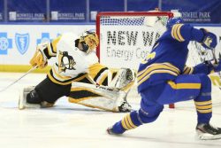 BUFFALO, N.Y. — Evan Rodrigues was so focused on the Pittsburgh Penguins’ late-season push to win the East Division title the forward didn’t realize the implications that came with beating his former team, the Buffalo Sabres. While the Penguins jumped into second in the tightly contested divisional race, their 3-2 win on Saturday also eliminated the Sabres from playoff contention. Rodrigues spent his first five-plus seasons in Buffalo before being traded to Pittsburgh a year ago. Tristan Jarry stopped 23 shots over the final two periods and 28 overall. Bryan Rust and Jared McCann also scored, and the Penguins improved to 10-2-2 in their past 14. Pittsburgh earned its 59th point to move one ahead of the idle New York Islanders, and remain three behind the Washington Capitals.