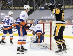 PITTSBURGH (AP) – Casey DeSmith made 19 saves after starter Tristan Jarry’s mysterious exit and the Pittsburgh Penguins held off the New York Islanders 2-1. Jarry left after the first period and DeSmith filled in by holding the Islanders at bay as Pittsburgh pulled even with New York in the East Division. Jared McCann scored his eighth goal of the season and Anthony Angello collected the first power-play goal of his career for the Penguins. Matt Martin scored his seventh of the season for the Islanders and Semyon Varlamov made 20 saves but couldn’t stop New York from getting swept during its final two-game set in Pittsburgh.