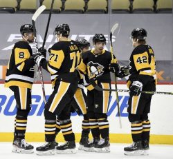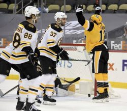 PITTSBURGH (AP) -Evgeni Malkin scored on a power play for his 1,100th career point and the Pittsburgh Penguins beat the Boston Bruins 4-1. Malkin is the third Russian-born player to reach 1,100 points in the NHL, joining Alex Ovechkin and Sergei Fedorov. Malkin has eight goals this season and also had an assist while extending his points streak to eight games. Tristan Jarry made a season-high 42 saves for Pittsburgh, Sidney Crosby scored his 11th goal of the season and had two assists, and Jake Guentzel also scored his 11th – including four in the past four games. Evan Rodrigues also scored for the Penguins.