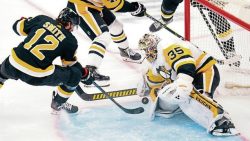 BOSTON (AP) – Craig Smith scored with 11 seconds left in overtime, and the Boston Bruins recovered after blowing a two-goal lead to beat the Pittsburgh Penguins 3-2. Brad Marchand had a short-handed goal and assisted on Nick Ritchie’s goal to help the Bruins earn their third straight victory. Tuukka Rask stopped 28 shots, giving up both Pittsburgh goals after he injured himself midway through the third period. Kasperi Kapanen tied it with 3:16 to go for the Penguins. Tristan Jarry stopped 33 shots for Pittsburgh, which had won four straight games since starting the season 0-2.