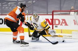 PHILADELPHIA (AP) – The Philadelphia Flyers have won the first NHL game of the 2021 season. Joel Farabee had a goal and three assists in the Flyers’ 6-3 decision over the Penguins. The game was tied 3-3 until Michael Raffl tallied 5:37 into the third period to begin a flurry of scoring for Philadelphia. Oskar Lindblom and Kevin Hayes scored 20 seconds apart to turn this one into a rout. Nolan Patrick also scored in his first game since April 2, 2019. The 22-year-old center and No. 2 overall pick in the 2017 draft was stricken with debilitating migraines that caused him to miss all of last season.