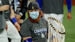 ARLINGTON, Texas (AP) – Major League Baseball says Justin Turner risked the safety of others by violating coronavirus protocols when he celebrated the Los Angeles Dodgers’ World Series win with his teammates and refused instructions from security to leave Globe Life Field. The commissioner’s office said Wednesday that it is starting a full investigation of the 35-year-old third baseman. Turner was pulled from Tuesday night’s game following the seventh inning after MLB was notified that he had tested positive for COVID-19. Dodgers president of baseball operations Andrew Friedman said Turner was quarantined in a doctor’s office off to the side. But he later returned to the field and took down his mask to pose for a team photo on the field. The commissioner’s office said it will consult with the players’ association as part of its investigation. The union was in the process of gathering facts on the events.