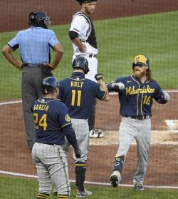 PITTSBURGH (AP) – Eric Sogard doubled home Brock Holt in the 11th inning and the Milwaukee Brewers rallied for a rain-delayed 6-5 win over the Pittsburgh Pirates. The Brewers trailed by four entering the ninth but took advantage of another shaky performance by the Pittsburgh bullpen to force extra innings. Ryan Braun’s two-out, two-run double off Kyle Crick drew Milwaukee even. Sogard led off the 11th with a liner down the left-field line, allowing Holt to score easily from second as the automatic runner. Colin Moran hit two home runs for the Pirates.