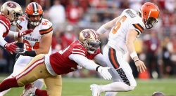SANTA CLARA, Calif. (AP) – Richard Sherman has a strong message for anyone still doubting the unbeaten San Francisco 49ers. “Don’t flip-flop,” Sherman said after the 49ers thumped the Cleveland Browns 31-3 on Monday night. “If you said we weren’t going to make it, you said we were some way early on, stick with that position. Hold it. Don’t try to give us credit now. At least stick by your word because I want you to sound like an idiot at the end. We know what we have in the building.” What the 49ers have is their best start since Joe Montana was throwing touchdowns to Jerry Rice. But it wasn’t the passing game that carried San Francisco past Cleveland. A steady, pounding running game and a dominant defensive effort did the trick this time. Matt Breida ran 83 yards for a touchdown on San Francisco’s first play from scrimmage, Baker Mayfield was harassed into his worst game as a pro, and the 49ers stayed unbeaten for their best start in nearly 30 years. Even then, there were some questioning San Francisco’s legitimacy. “I feel like they’re going to say that all year about us,” said Breida, who had 114 yards on 11 carries. “I don’t think anyone expected us to be 4-0 this year, to be honest. Probably expected us to be 0-4. They can say whatever they want. All that matters is who’s in this locker room.” Tevin Coleman added a 19-yard score as part of a dominant ground game on a day when quarterback Jimmy Garoppolo passed for 181 yards and kicker Robbie Gould missed a pair of field goal attempts and had a third try blocked. San Francisco (4-0) joined the 5-0 New England Patriots as the only remaining undefeated teams in the NFL. It’s the first time the 49ers have won their first four games since 1990. “It’s a good start is really all it is,” Garoppolo said. “We have a good mindset in that locker room.” The Browns (2-3) are headed the opposite direction after losing two of three, with fresh concerns about their young quarterback.