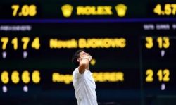 WIMBLEDON, England (AP) – Novak Djokovic has become the first man in 71 years to win Wimbledon after facing match points in the final, coming back to beat Roger Federer in an unprecedented fifth-set tiebreaker Sunday. The top-seeded Serb outlasted Federer 7-6, 1-6, 7-6, 4-6, 13-12 in a match that lasted nearly five hours to win his fifth championship at the All England Club and second in a row. The triumph earned Djokovic his 16th Grand Slam trophy, moving him closer to the only men ahead of him in tennis history: Federer with 20, and Rafael Nadal with 18. Federer, who turns 38 next month, has won Wimbledon eight times dating to 2003, and this was his record 12th appearance in the title match. But Djokovic is now 3-0 against Federer in Wimbledon finals and 4-0 against him in five-setters. This is the first year Wimbledon has used deciding-set tiebreakers.