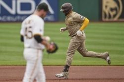 PITTSBURGH (AP) — San Diego’s Fernando Tatis Jr. sprinted home on a wild pitch by Pittsburgh closer David Bednar in the top of the ninth inning to lift the Padres past the Pirates 2-1. Tatis led off the ninth with a double. He stole third and took off when a pitch from Bednar (0-3) to Xander Bogaerts skipped in front of catcher Joey Bart. The ball squirted to Bart’s right. Tatis’ slide just beat Bart’s lunging tag to give the Padres their fourth straight victory. Pirates starter Bailey Falter held San Diego to two hits over seven innings. Pittsburgh has dropped six of seven.